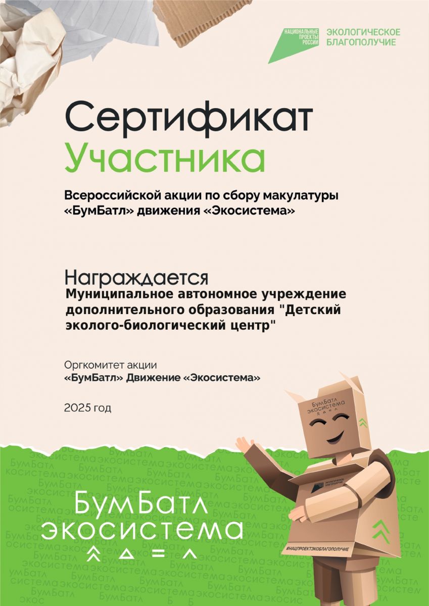С 20 октября по 10 ноября 2025 года в 1 корпусе МАУДО «Детский эколого-биологический центр», прошла Всероссийская экологическая акция «БумБатл» по сбору макулатуры и картона. Всероссийская акция по сбору макулатуры в поддержку национального проекта «Экология», который реализуется по решению Президента РФ. Акция проходит под эгидой Всероссийского экологического общественного движения «Экосистема». «БумБатл» дает возможность проявить заботу о природе через сбор и сортировку бумаги.